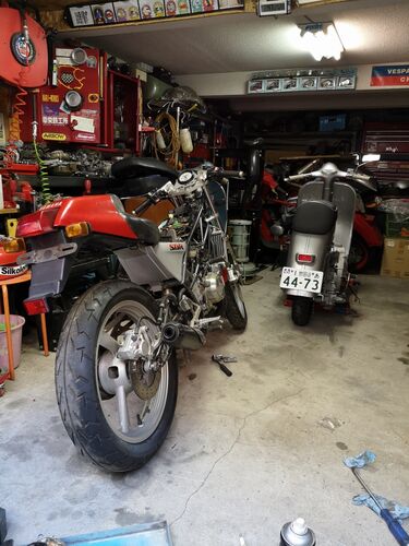 週末、某場所にてバイクいじり。 走行距離わずか100km程度でクランクがご臨終された私のベスパの修理の続き。クランクの交換ついでにリードバルブ化しちゃったw。だってパーツがあったんだもの・・・。 ガレージには友人の新たなおもちゃが入庫。今となって…